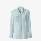 Long-sleeved shirt with bowling collar and patch pockets on the chest. Button fastening. Made of a light blue silk and viscose blend fabric, embellished with a burnout Pequin pattern with FF details. The sleeves are finished with cut-out sections on the hem and oversized, wide cuffs.