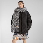 Long scarf with fringe motif at the hem. Made of soft alpaca and wool yarn with the collection’s Falena Dots motif all over in black and white. Finished with a beige leather patch on the front and embossed Fendi logo.
