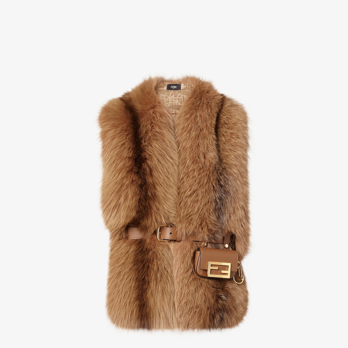 Multifunctional maxi stole with matching leather belt. Made of brown fox fur. Finished with tone on tone silk lining. Gold-finish metalware.