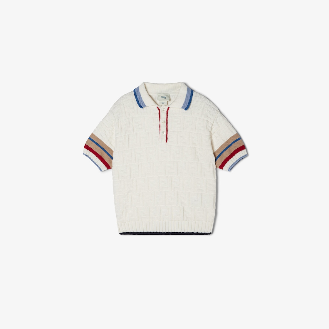 Cotton knit junior polo shirt with white tone-on-tone all-over FF motif and multicolour stripe details on the collar, sleeves and waist.