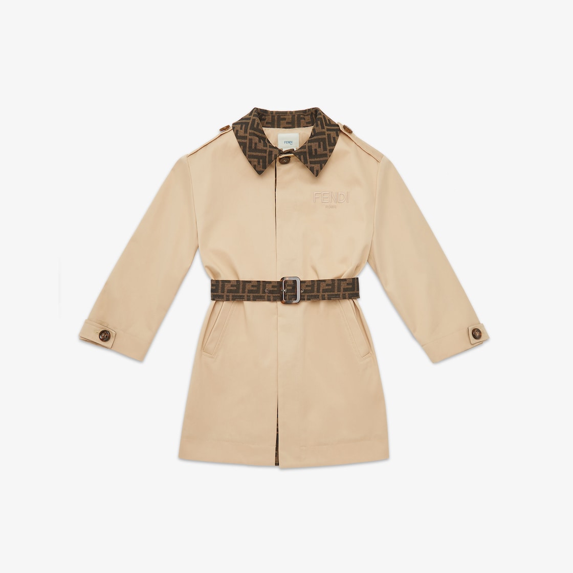 Beige gabardine junior trench coat with collar and belt in tobacco-colour FF logo.