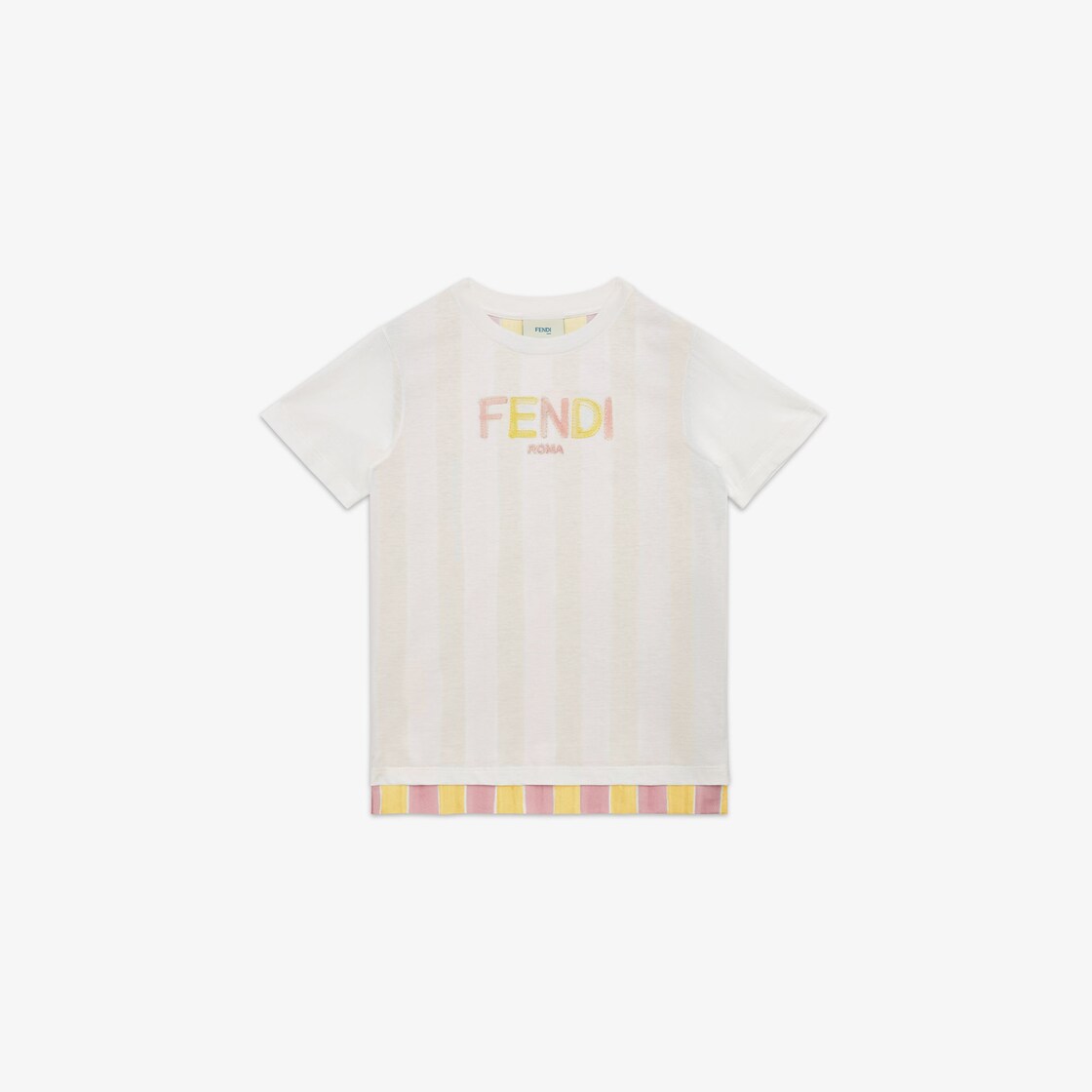 Short-sleeved junior T-shirt with the front in white jersey with a multicoloured Fendi logo, and the back in poplin with a multicoloured Pequin motif in yellow and lilac.