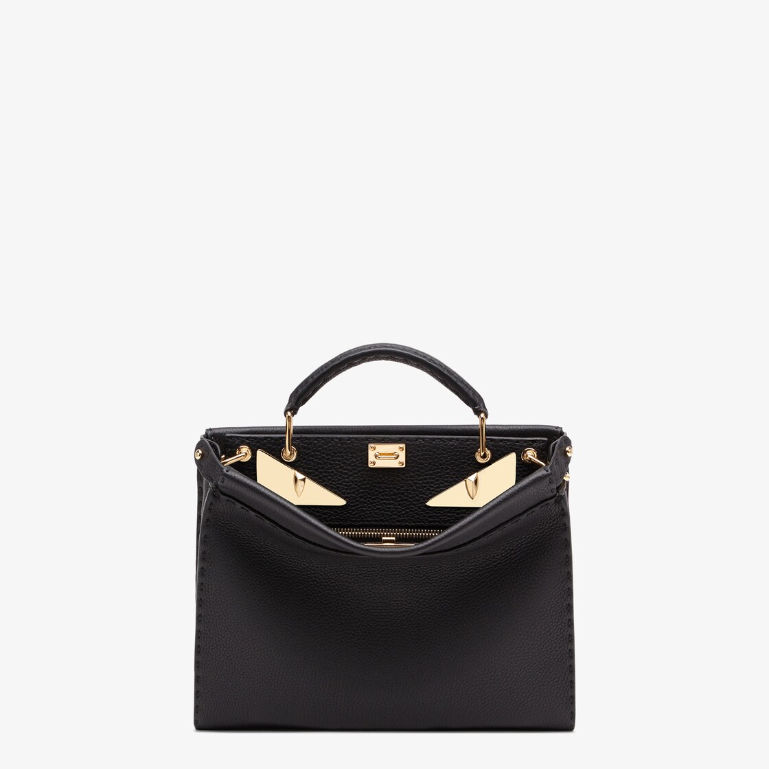 Small handbag made with two compartments divided by a stiff partition. Zipped inside pocket. Front clasp. Briefcase handle and a long adjustable and detachable shoulder strap. Made of black Romano leather. Metal appliqués in the shape of Bag Bugs eyes. Gold-finish metalware.