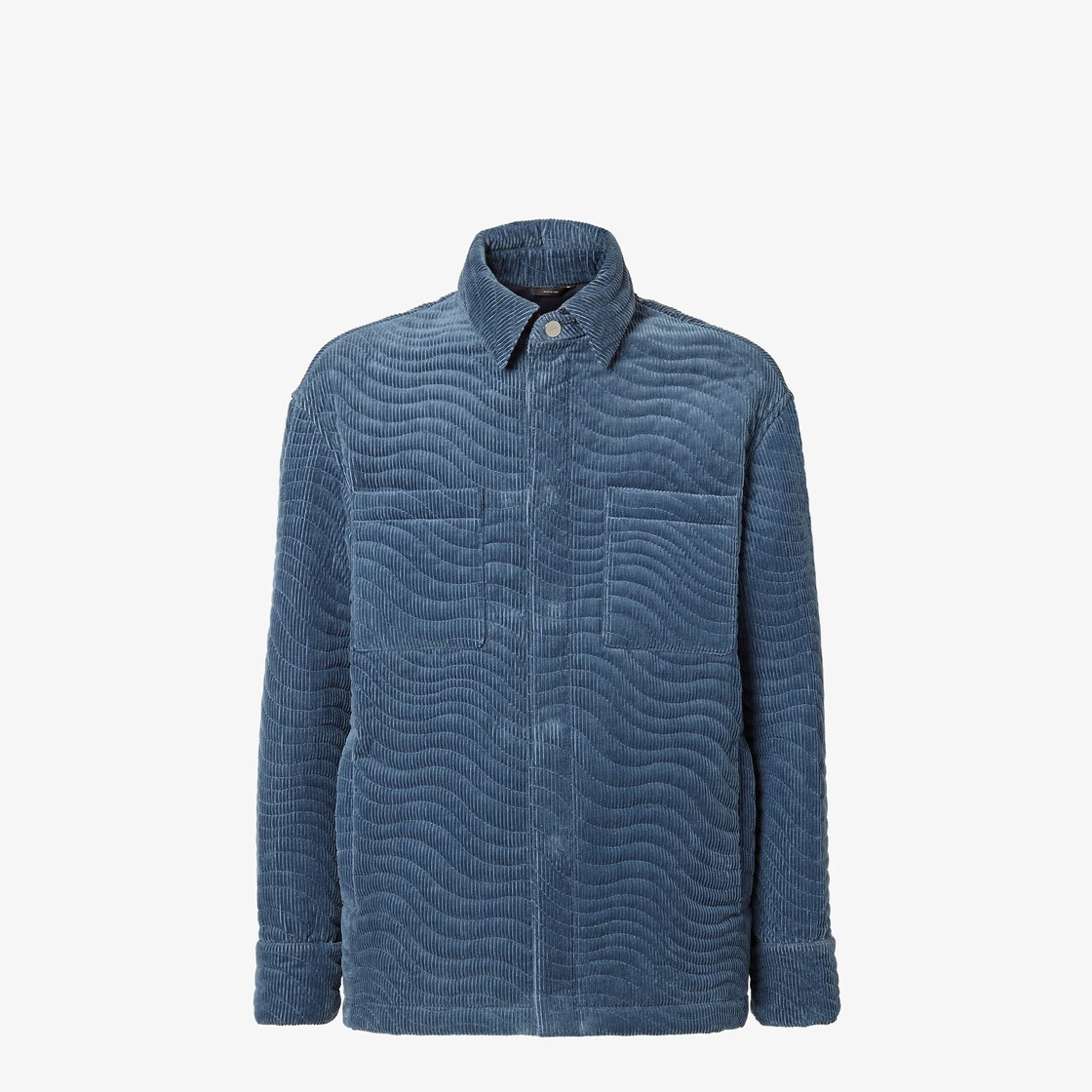 Go-To single-breasted jacket with shirt collar and patch pockets on the chest. Vertical welt pockets on the sides. Concealed button fastening. Made of airforce blue corduroy. Slightly padded and quilted with an all-over diagonal motif.