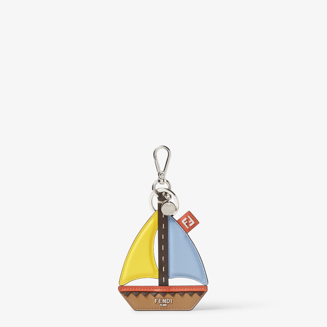 Bag charm made of multicoloured smooth leather and brown FF Canvas with metal Fendi Roma lettering. The charm is distinguished by its exclusive boat-shaped design. Palladium-finish metalware with logo clip.