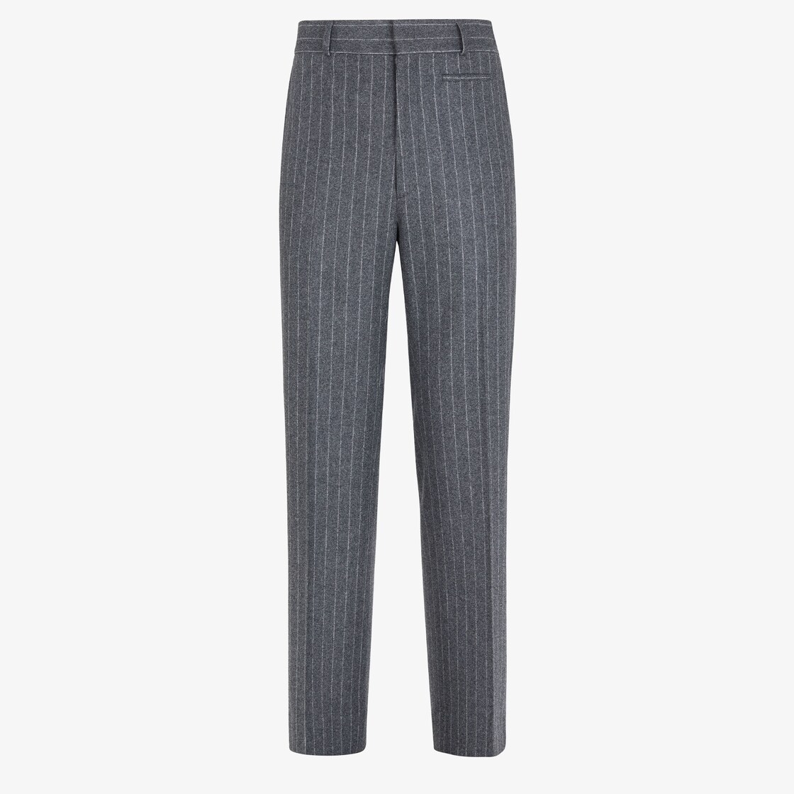Relaxed-fit trousers with covered zip fastening. Pockets on the sides, watch pocket and welt pockets with button on the back. Made of grey pinstripe wool flannel.
