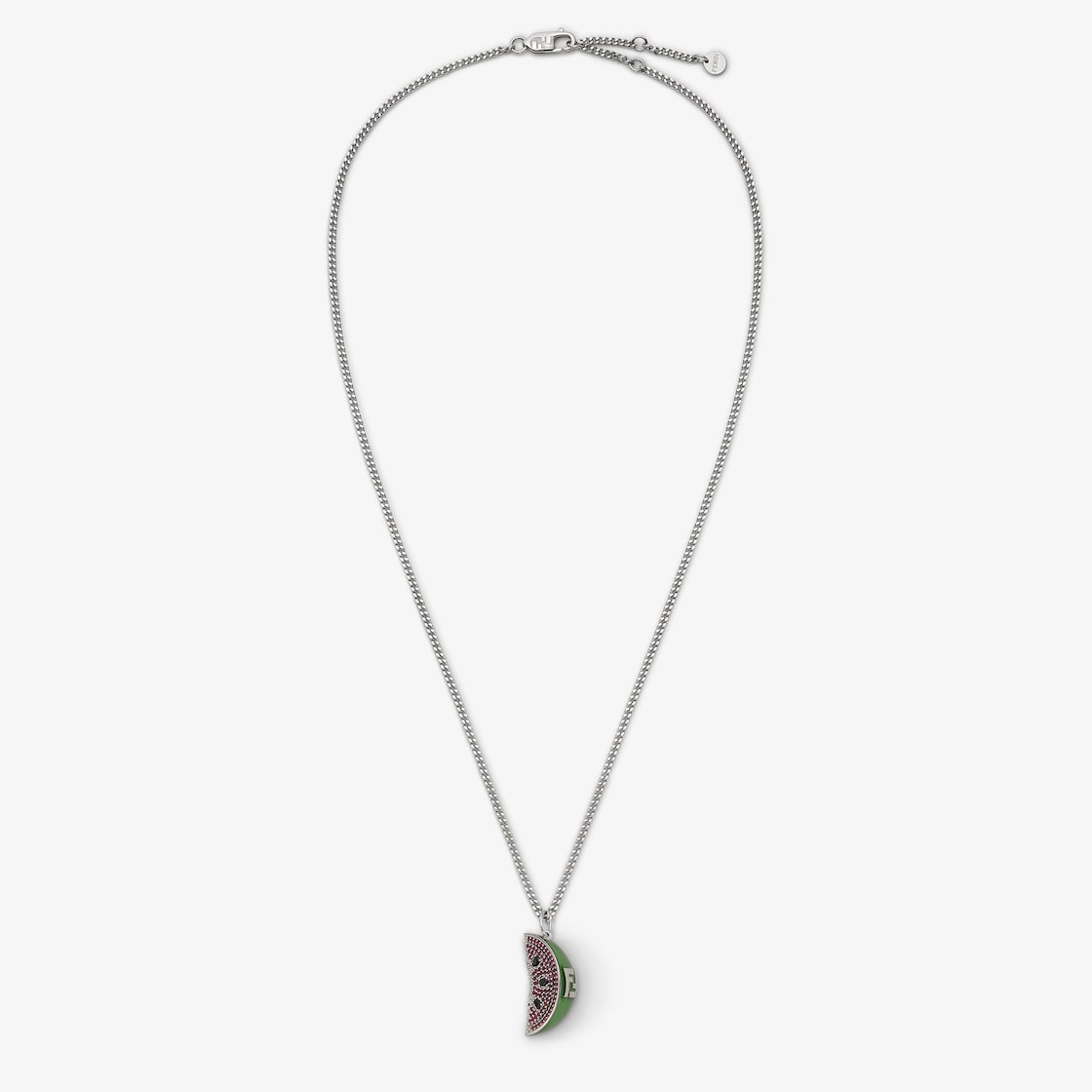 Fine chain necklace with watermelon slice-shaped pendant. Adjustable clip fastening. Made of metal with a palladium finish. The chain is embellished with red and black set crystals, an embossed FF and green enamel details.