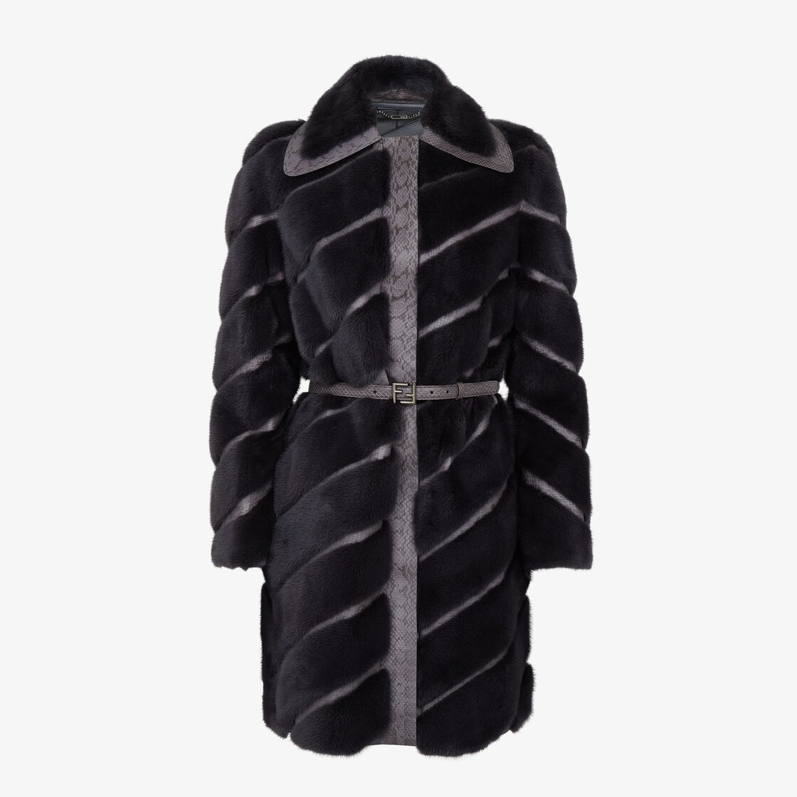 Dark grey mink coat. Decorated with a diagonal Pequin motif and elaphe inserts.