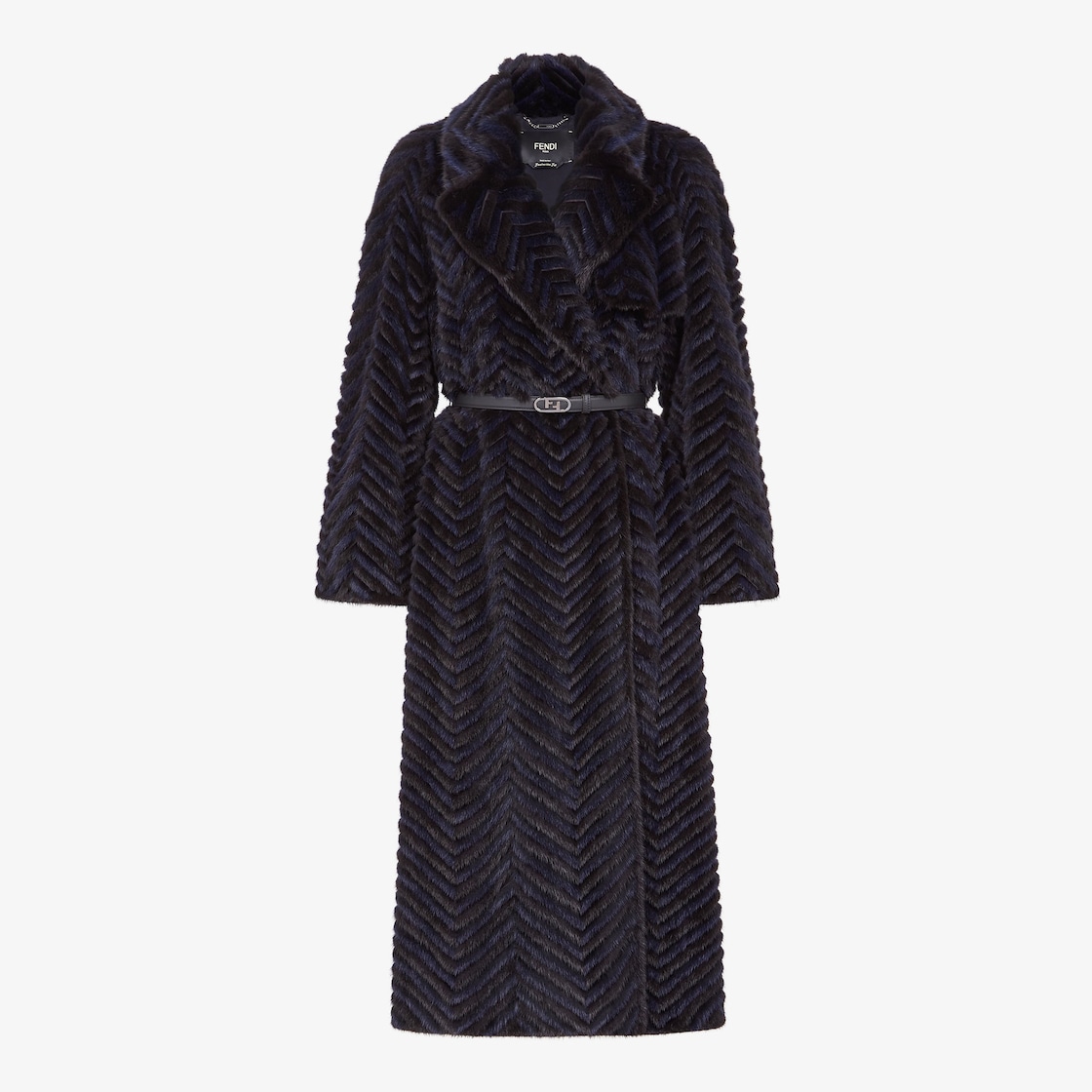 Long trench coat. Matching leather belt with metal Fendi O’Lock buckle. Made of mink with black and blue chevron motif. The special Featherlike construction makes the item exceptionally lightweight.