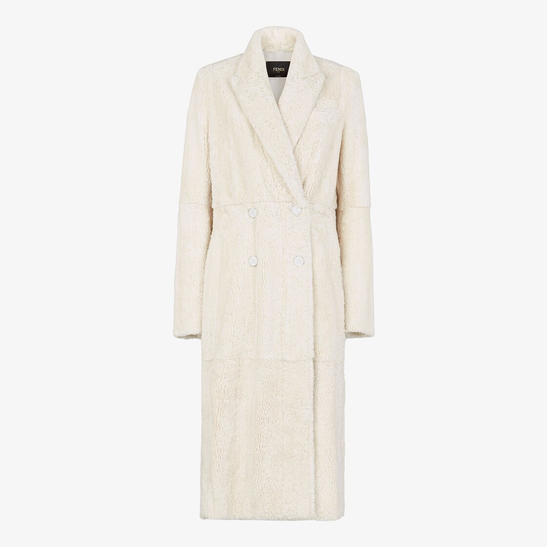 Straight-cut, double-breasted coat. This style has classic lapels and a breast pocket. Made of washed white mink fur. Embellished with matching FF Karligraphy buttons. Crêpe de Chine lining with FF Karligraphy motif.