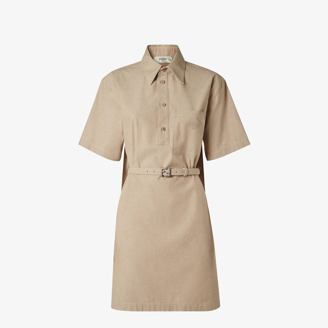 Gently flared short dress. Shirt collar and short sleeves. Side pockets and patch pocket on the chest. Matching belt. Polo-shirt fastening with four buttons. Made of light brown denim chambray. Embellished with yarn-embroidered Fendi Roma lettering on the breast pocket.