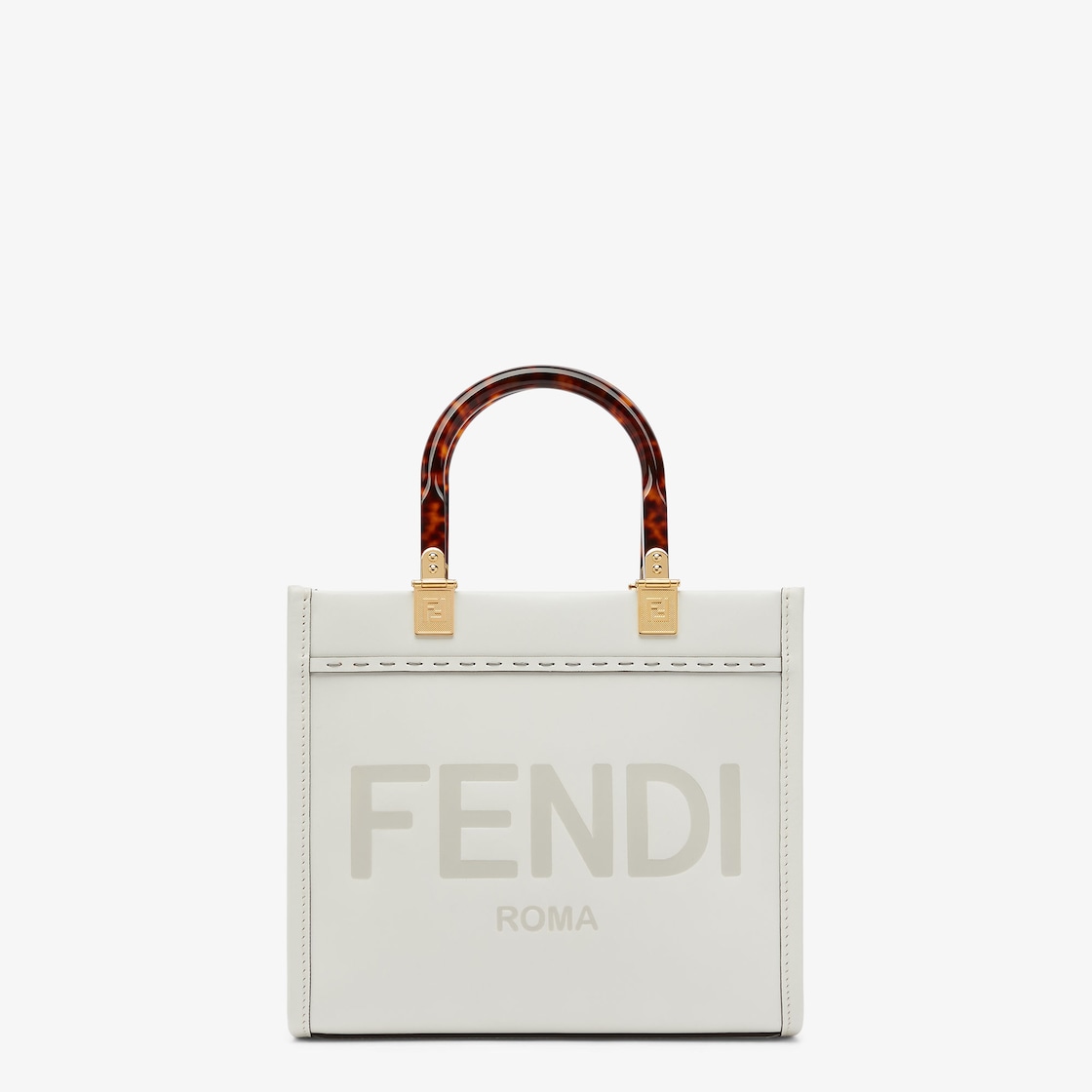 Small Sunshine Shopper bag made of white leather with hot-stamped FENDI ROMA lettering and stiff tortoiseshell plexiglass handles.
