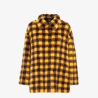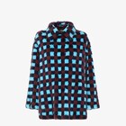 Straight-cut pea coat with shirt collar and side slits at the hem. Single-breasted fastening with small invisible hooks. Made of mink with Vichy pattern in turquoise and burgundy. The specially woven mesh makes the item very light to wear.