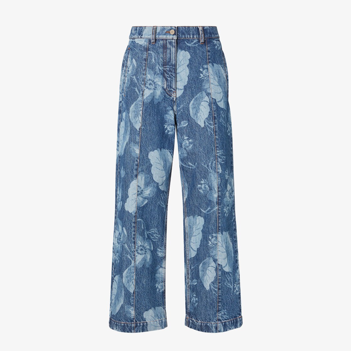 Long, regular-fit straight trousers with sewn-in crease on the leg. Side welt pockets and pockets on the back. Concealed zip and logo stud button closure. Made of dark blue cotton denim, with an all-over Sea Garden motif print in a slightly contrasting colour. Embellished with tobacco-coloured stitching and leather strap on the back with logo.