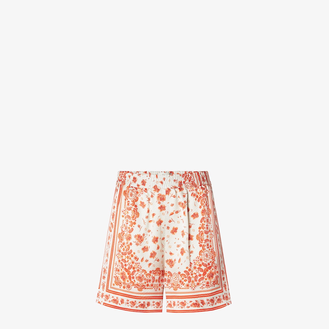 Shorts with elasticated waist. Made of white silk jacquard crêpe with pink Coral Bandana print.