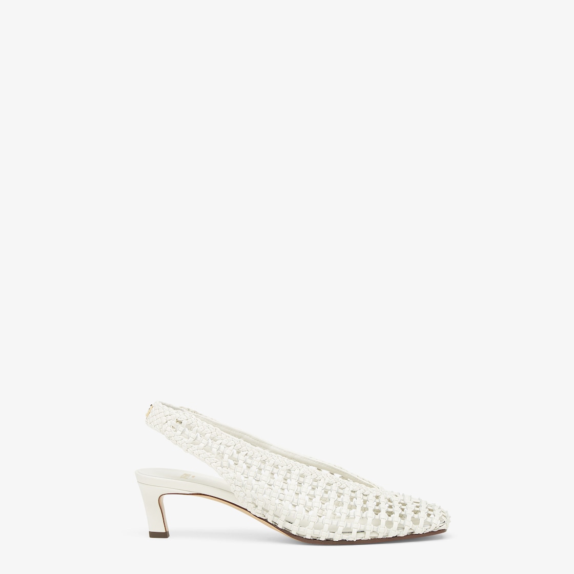 Slingbacks with a slightly square toe, thin straps and low heel. Embellished with a metal FF appliqué on the back of the strap. Made of hand-woven white leather. It takes nine hours to craft each pair. Gold-finish metalware.