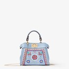 Sac iconique Peekaboo version Nano reproduite dans le moindre détail. Doté d’intérieurs doublés en cuir, de deux compartiments séparés par une paroi rigide, d’une poignée amovible avec deux boutons-pression et du fermoir-tourniquet emblématique de la marque. La bandoulière en fine chaîne permet de le porter à la main ou croisé. En denim de coton biologique à lavage bleu clair, finement brodé de perles de verre et sequins de différentes formes, tailles et couleurs, rappelant les précieuses murrines vénitiennes. Détails en cuir de veau ton sur ton. Garnitures en métal finition dorée.