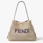 Sac hobo, grand modèle, souple et déstructuré, réalisé en raphia tressé orné de l’inscription FENDI en bleu foncé. Orné d’application FF en métal. Base en cuir de veau bleu foncé.