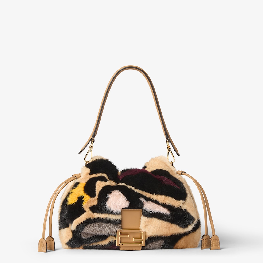 En doux vison de différents coloris, incrusté à la main pour créer un motif abstrait qui rappelle les ailes de papillon. Orné du fermoir FF et de détails en cuir couleur cappuccino.