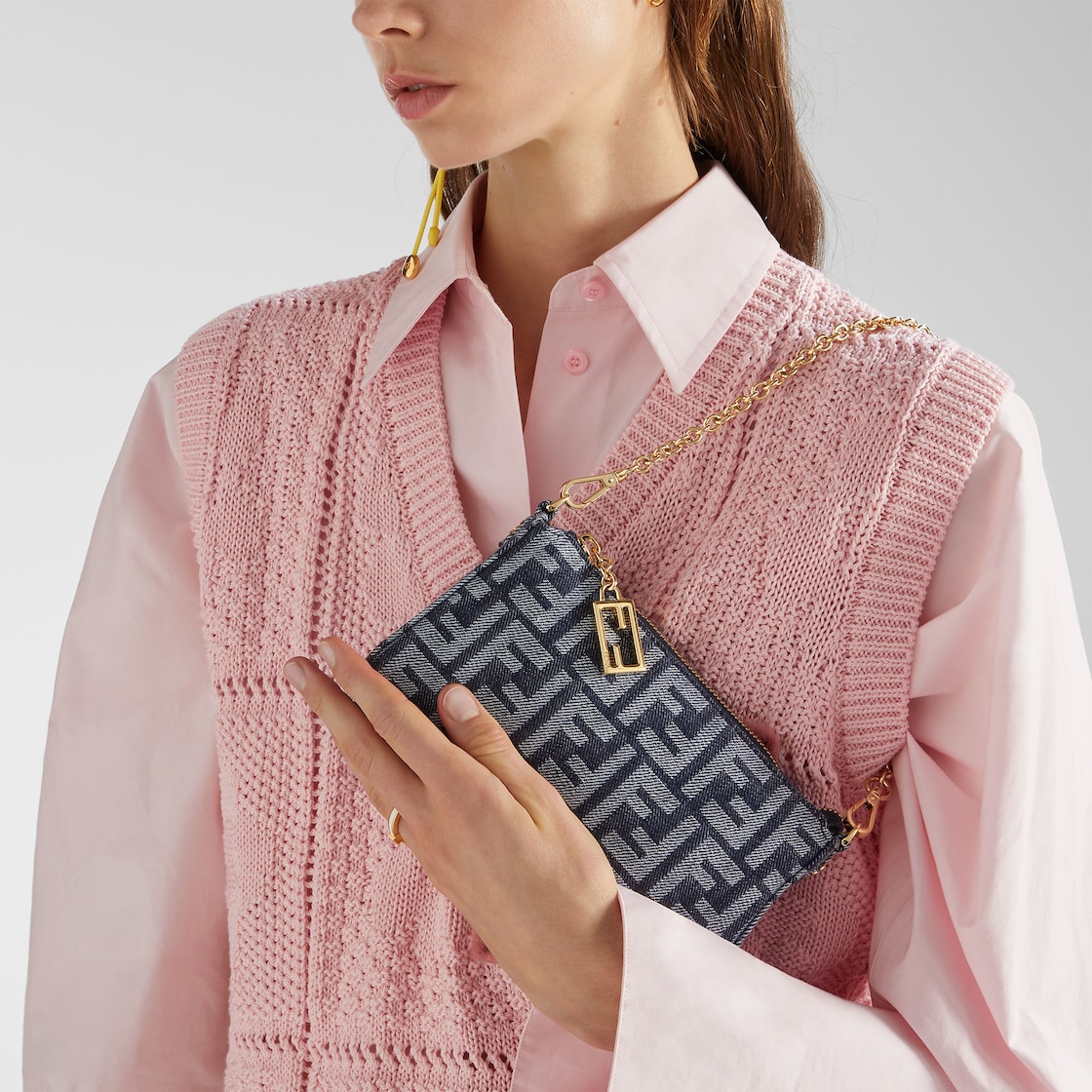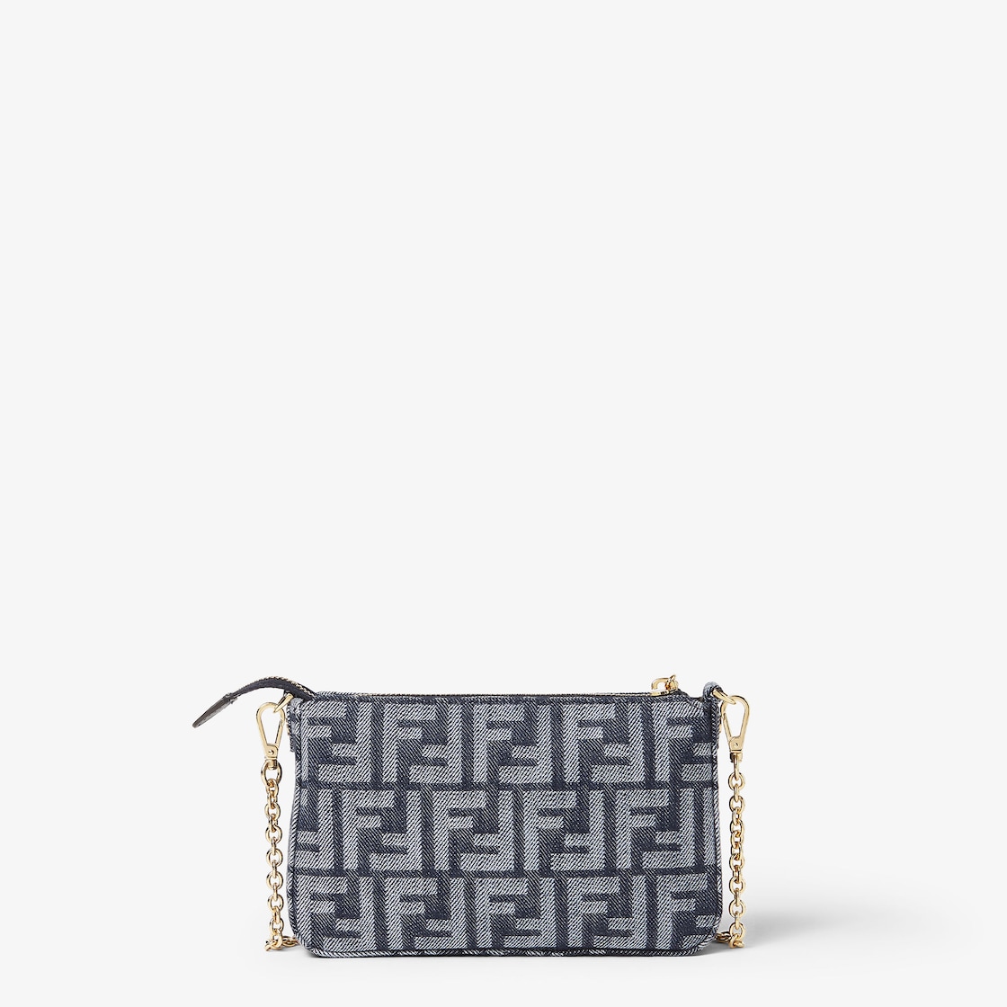 Pochette Baguette en jacquard FF effet denim dans les tons bleus. Fermeture zippée et tirette avec motif FF emblématique en métal. Intérieur doublé, avec poche dotée de fentes porte-cartes et garnitures en métal finition dorée. La bandoulière courte en chaîne fine et la bandoulière longue en cuir de veau bleu foncé, toutes deux amovibles, permettent de le porter à la main, sous le bras ou croisé. Il peut contenir un smartphone de 6,7 pouces et des clés. Porte-cartes intégré à l’intérieur du sac.