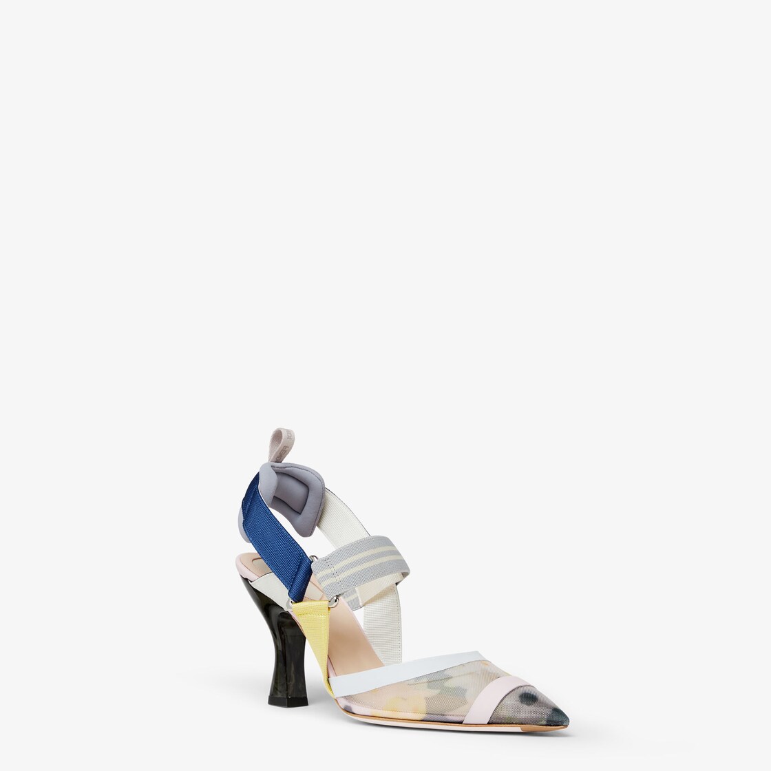 Chaussures à bride Colibrì, aux lignes fuselées et féminines, avec des rubans élastiques enveloppant le pied. La semelle est complétée par une partie en relief en caoutchouc. En maille avec imprimé Fendi Bouquet multicolore. Le coussinet rembourré et le crochet de trekking ajoutent une touche sportive. Talon habillé de cuir noir.