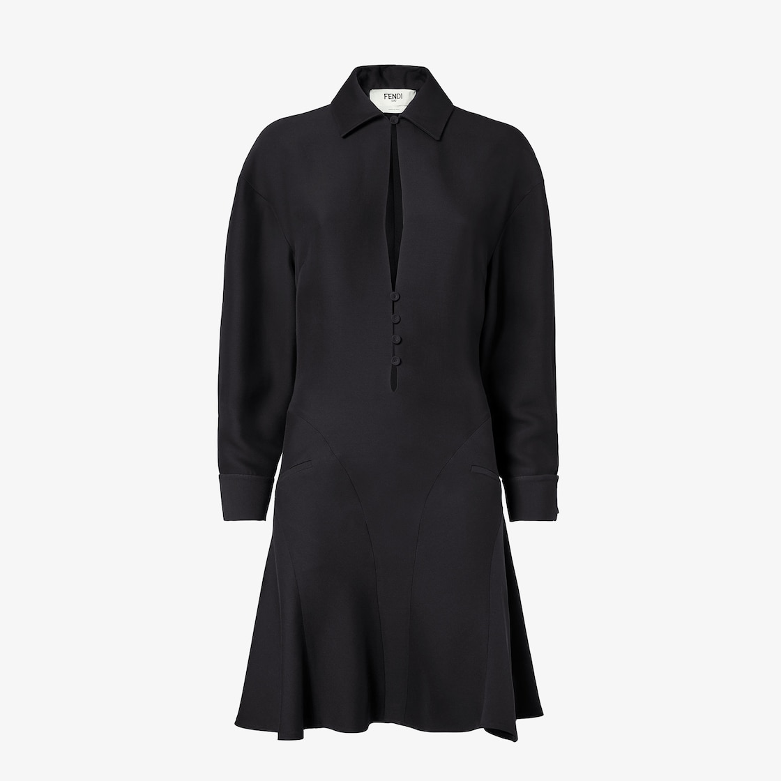 Robe courte avec taille marquée et jupe légèrement évasée. Col chemise et manches longues avec épaule basse. Découpe sur le devant et fermeture devant à boutons bas et bouton unique sur le col. Modèle doublé. En cady de soie noir.