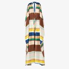 Combinaison fluide sans manches avec amples drapés latéraux à la manière de manches. Profond décolleté en V sur le devant et au dos et cordon de serrage réglable à la taille. Fermeture par liens à nouer dans la nuque. En soie habotai avec motif Venetian Stripes imprimé all-over dans des tonalités multicolores de marron, vert et bleu.