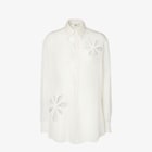 Chemise à manches longues avec fentes latérales arrondies. Pli central au dos et poignets boutonnés. Fermeture boutonnée dissimulée. En organza de soie blanc avec motif Fendi Ajour souligné d’un liseré dans les mêmes tons. Les détails découpés et le jeu de textures créent un superbe effet 3D.