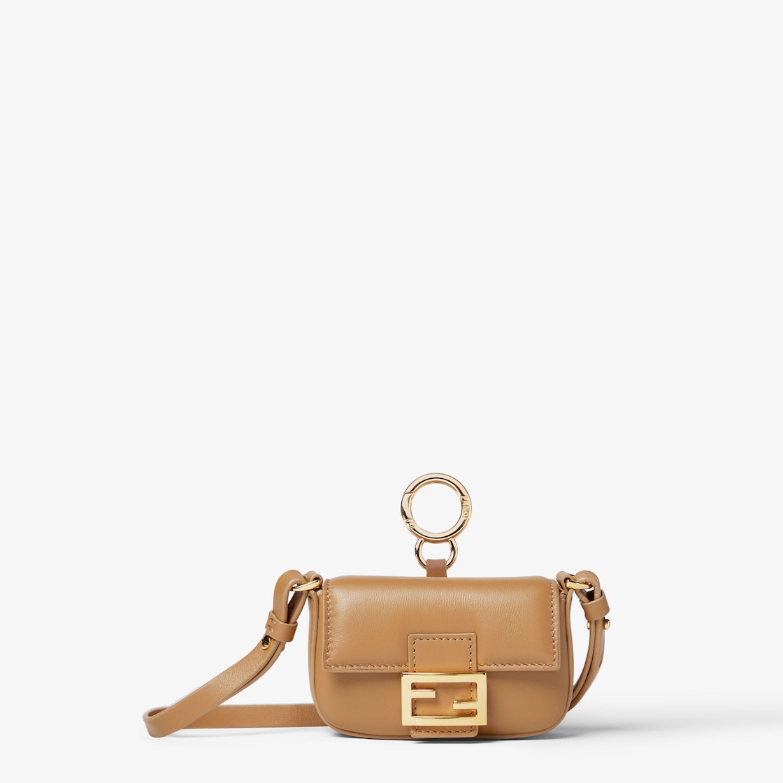 Sac Baguette emblématique, version Nano, avec rabat et fermeture mini FF par bouton aimanté. La pince permet de l’attacher comme un bijou à un sac plus grand ou à une ceinture. La fine bandoulière réglable et amovible en cuir permet également de le porter à l’épaule ou à la main. En cuir nappa souple couleur cappuccino. Garnitures en métal finition dorée.