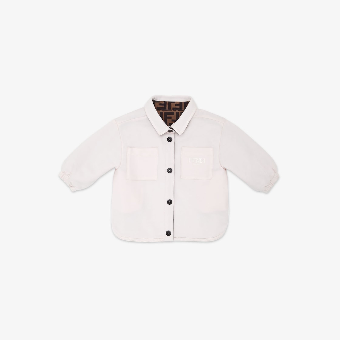 Veste-chemise bébé réversible. L’un des côtés est en molleton rose avec broderie Fendi Roma, et l’autre est en nylon entièrement recouvert du motif FF couleur tabac.