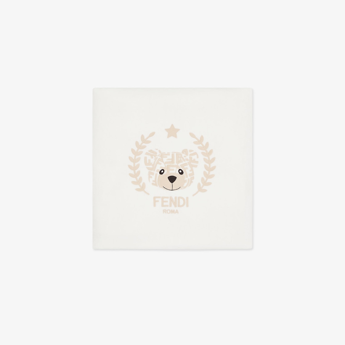 Couverture bébé en chenille blanche avec broderie centrale motif ourson Fendi dans les tons beiges.