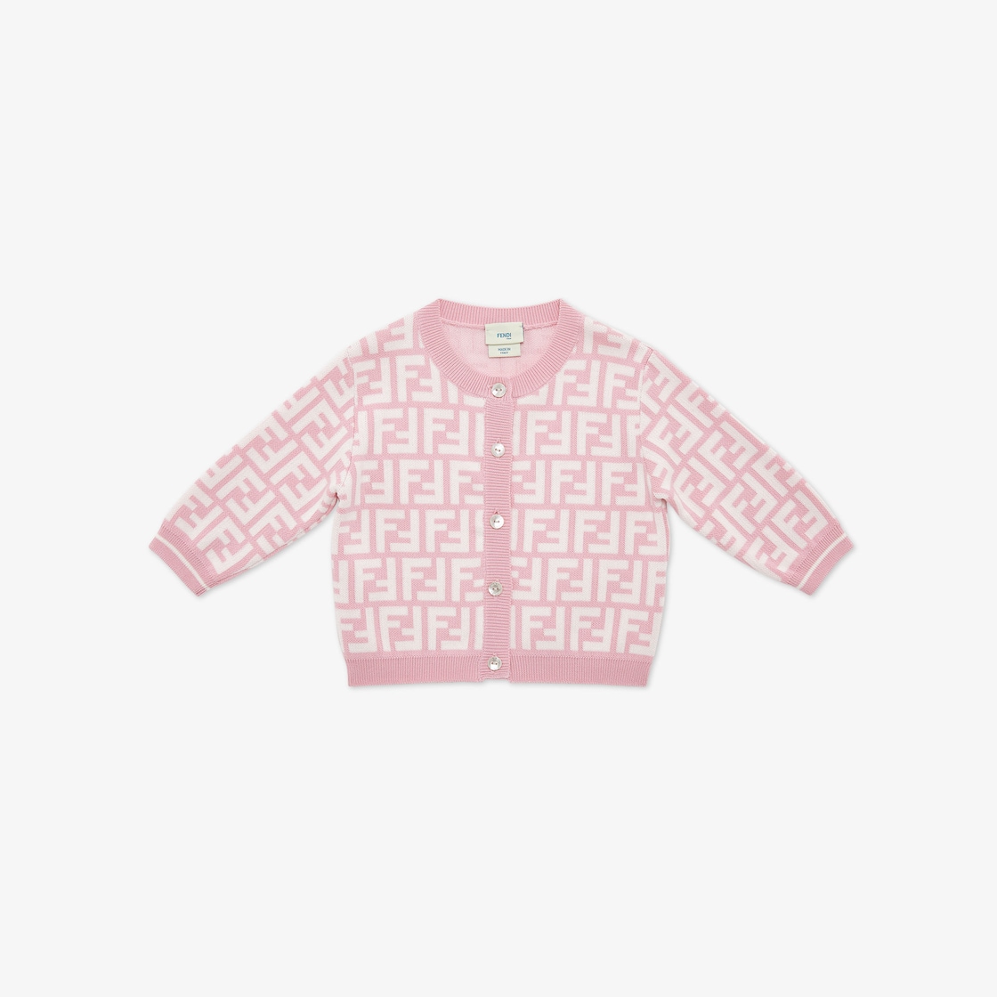 Cardigan bébé en maille de coton avec logo FF intégral multicolore dans les tons blanc et rose.
