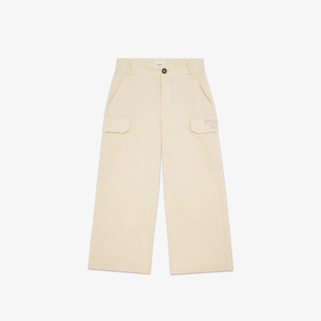 Pantalon enfant modèle cargo en popeline couleur sable avec broderie Fendi ton sur ton sur la poche.