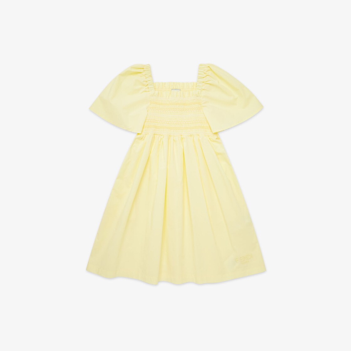 Robe enfant en popeline jaune à manches ballon, motifs élastiqués sur le devant et broderie Fendi ton sur ton appliqué sur la jupe..