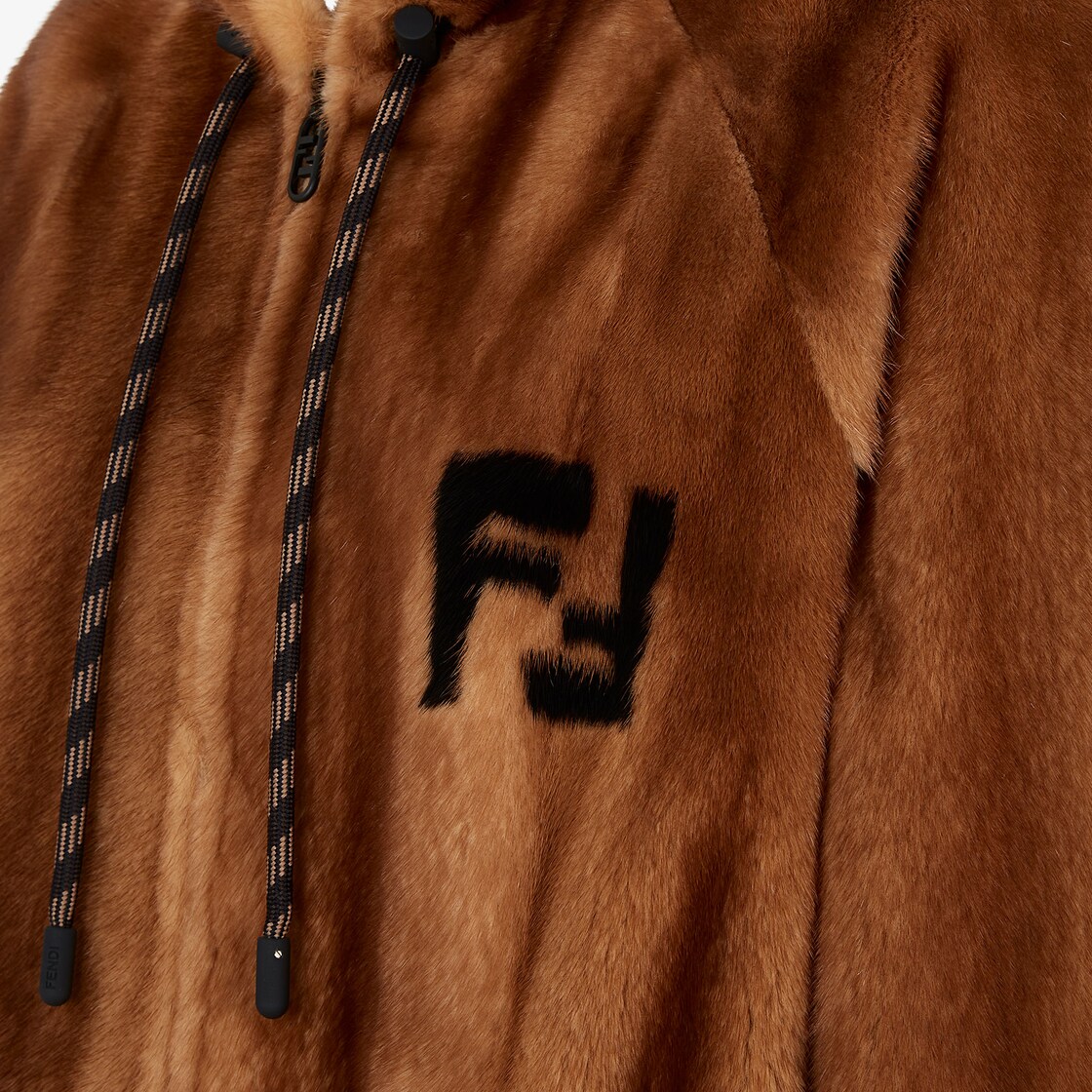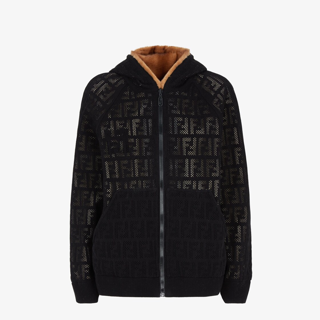 Sweat-shirt réversible à la coupe légèrement surdimensionnée, avec capuche et poches kangourou sur le devant. Poignets et bord en maille. Fermeture zippée et double curseur Fendi O'Lock en métal. En vison naturel avec motif FF incrusté en contraste sur la poitrine. Intérieur en maille noire ajourée avec motif FF.