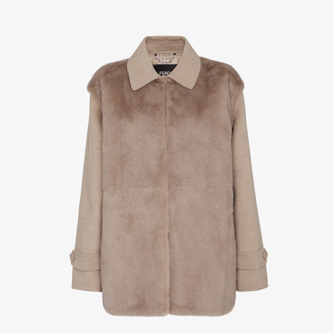 Veste droite avec col chemise. Manches longues avec emmanchures tombantes, brandebourgs et boutons recouverts aux poignets. Poches passepoilées sur les côtés. Fermeture dissimulée. En tissu de laine double beige avec empiècements sur le devant en vison ton sur ton. Intérieur orné du motif FF.