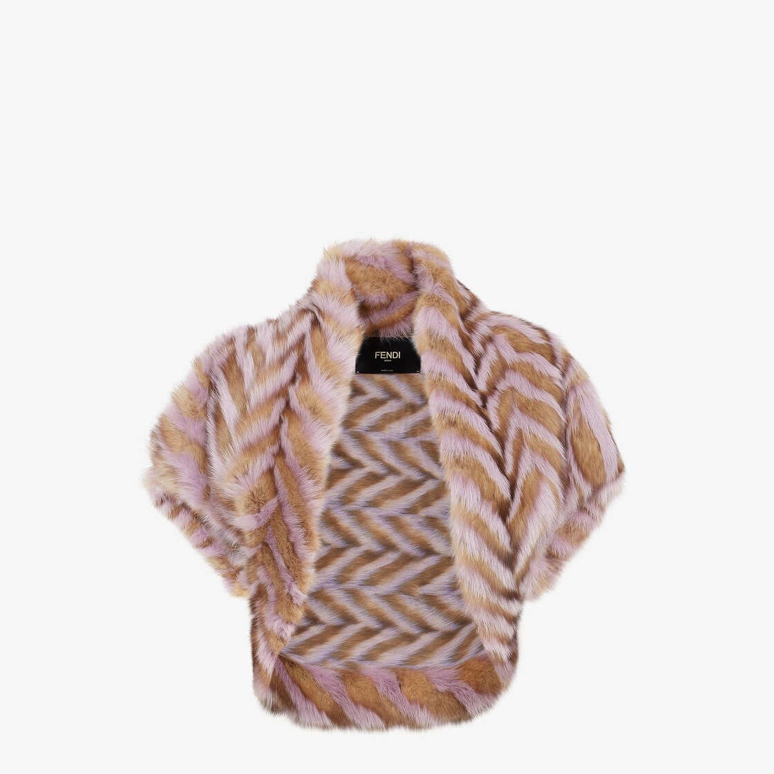 Cape courte dépourvue de fermeture. En zibeline dans les tons beiges, incrustée ton sur ton pour créer un motif de chevrons. Doublure en soie.