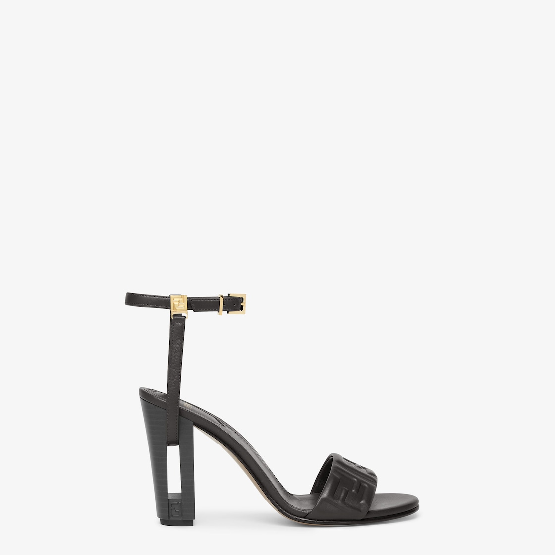 Sandales Delfina avec bout arrondi et bride à la cheville. En nappa noir avec motif FF en relief ton sur ton. Talon en résine imprimée effet cuir avec détail découpé et motif FF ton sur ton. Garnitures en métal finition dorée.