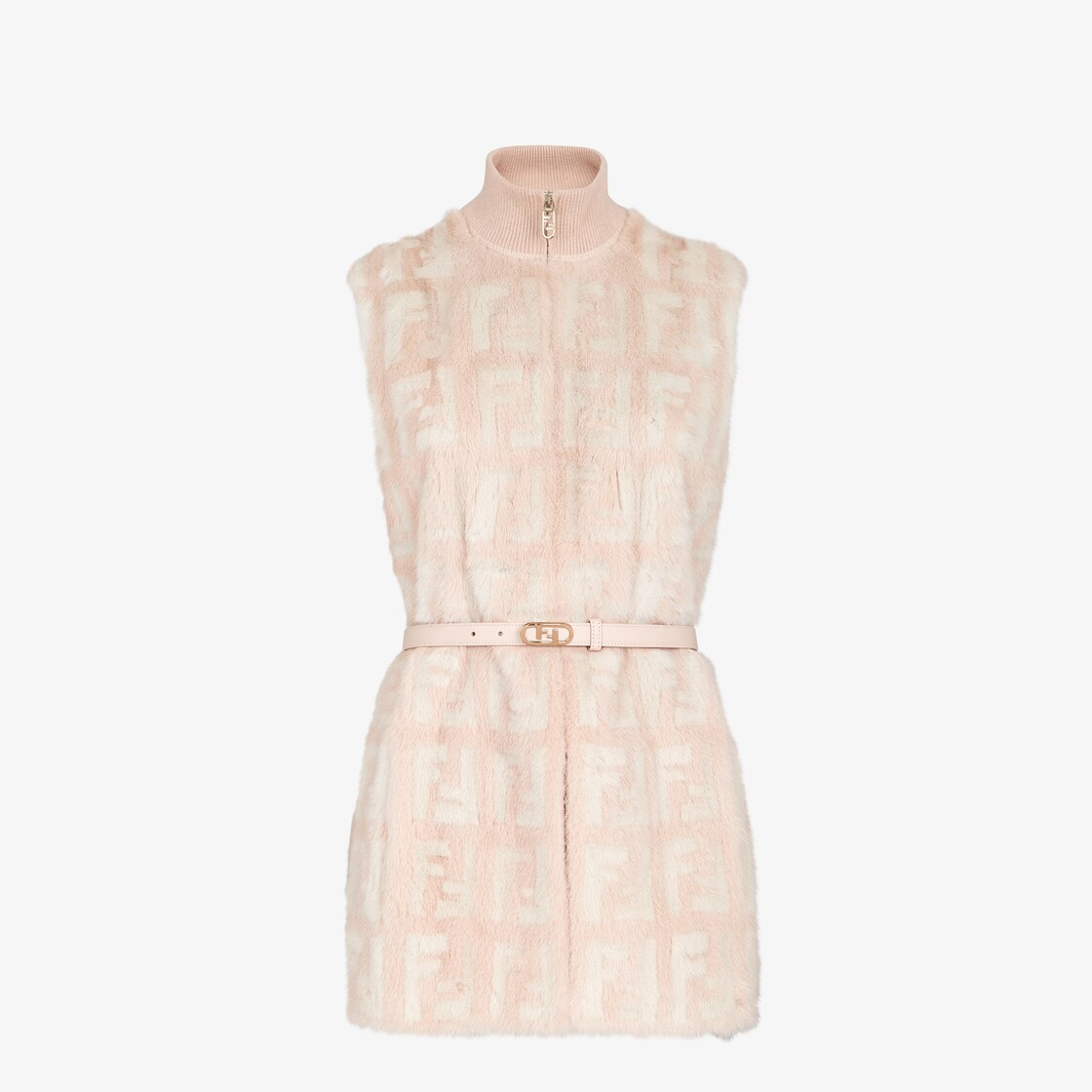 Veste sans manches réalisée en maille de velours et viscose avec motif FF. Empiècement en vison sur le devant avec motif FF incrusté dans les tons blanc perle et rose clair. Finition bords côtelés. Vêtement non doublé.