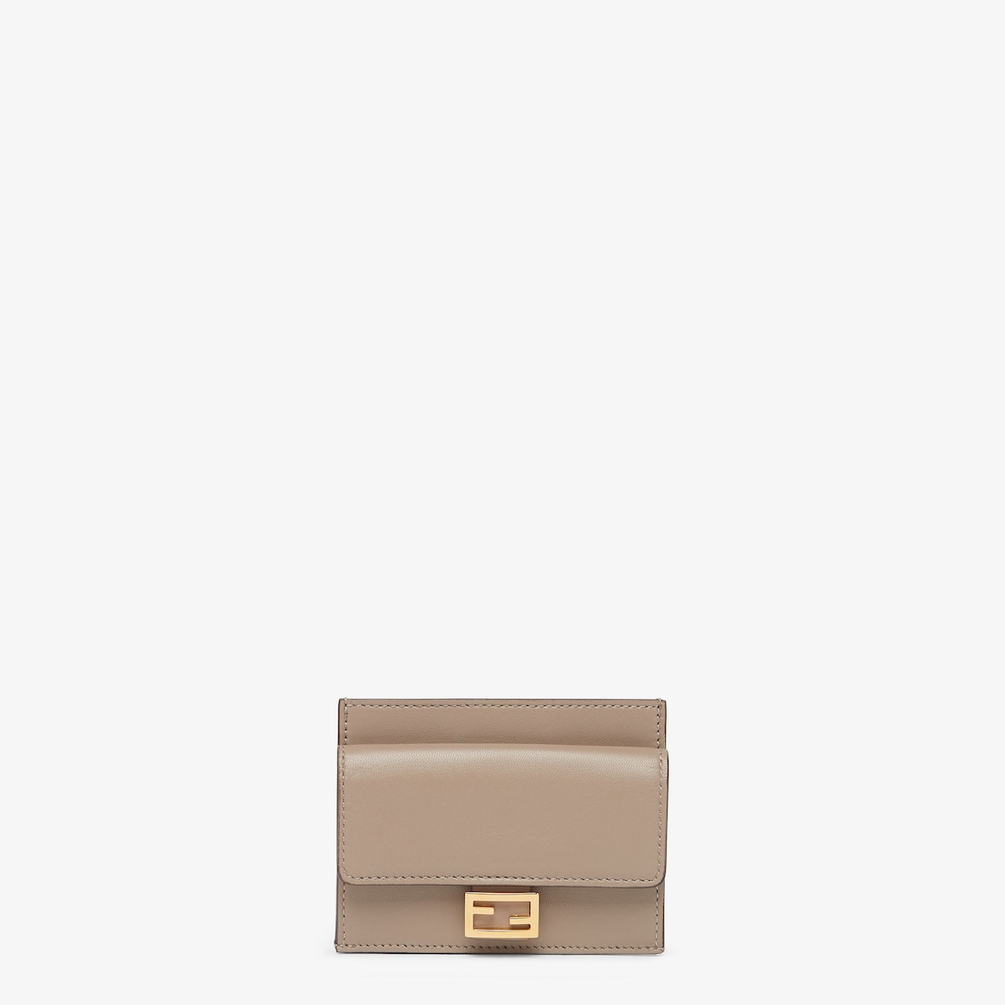 Porte-cartes Baguette à trois fentes et poche porte-monnaie avec bouton-pression. En cuir nappa couleur taupe. Détail de motif FF en relief. Accessoires en métal à finition dorée.