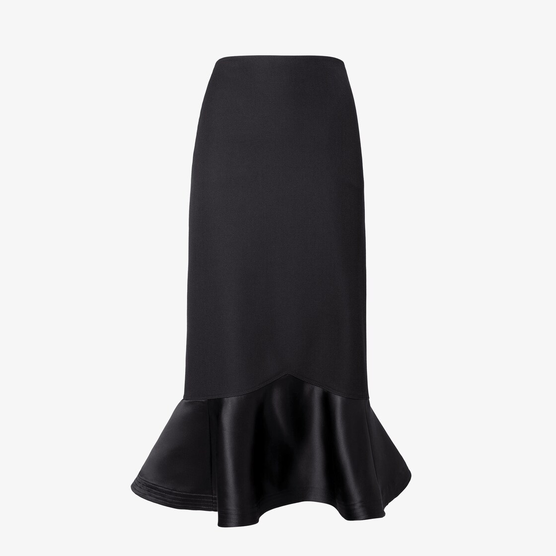 Jupe mi-longue à la silhouette peplum caractéristique, avec taille haute marquée et évasée dans le bas. Modèle doublé. Fermeture zippée. Réalisée en grain de poudre de laine noire.