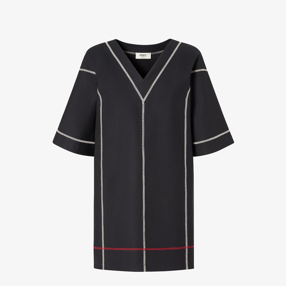 Robe courte à la coupe tunique. Encolure en V et manches courtes amples. En coton compact stretch noir. Finition avec surpiqûres contrastées effet endroit-envers dans les tons rouge et blanc. Logo placé sur la hanche gauche.