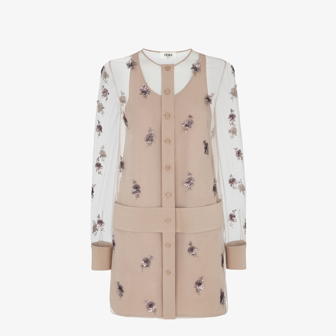 Robe courte à col rond avec manches longues avec poignet de chemise. Fermeture avant avec boutons à logo sur toute la longueur. En tulle très léger de couleur beige et ornée du motif floral brodé en sequins 3D et détails en fil de soie. Le fond de robe assorti crée un effet trompe-l’œil.