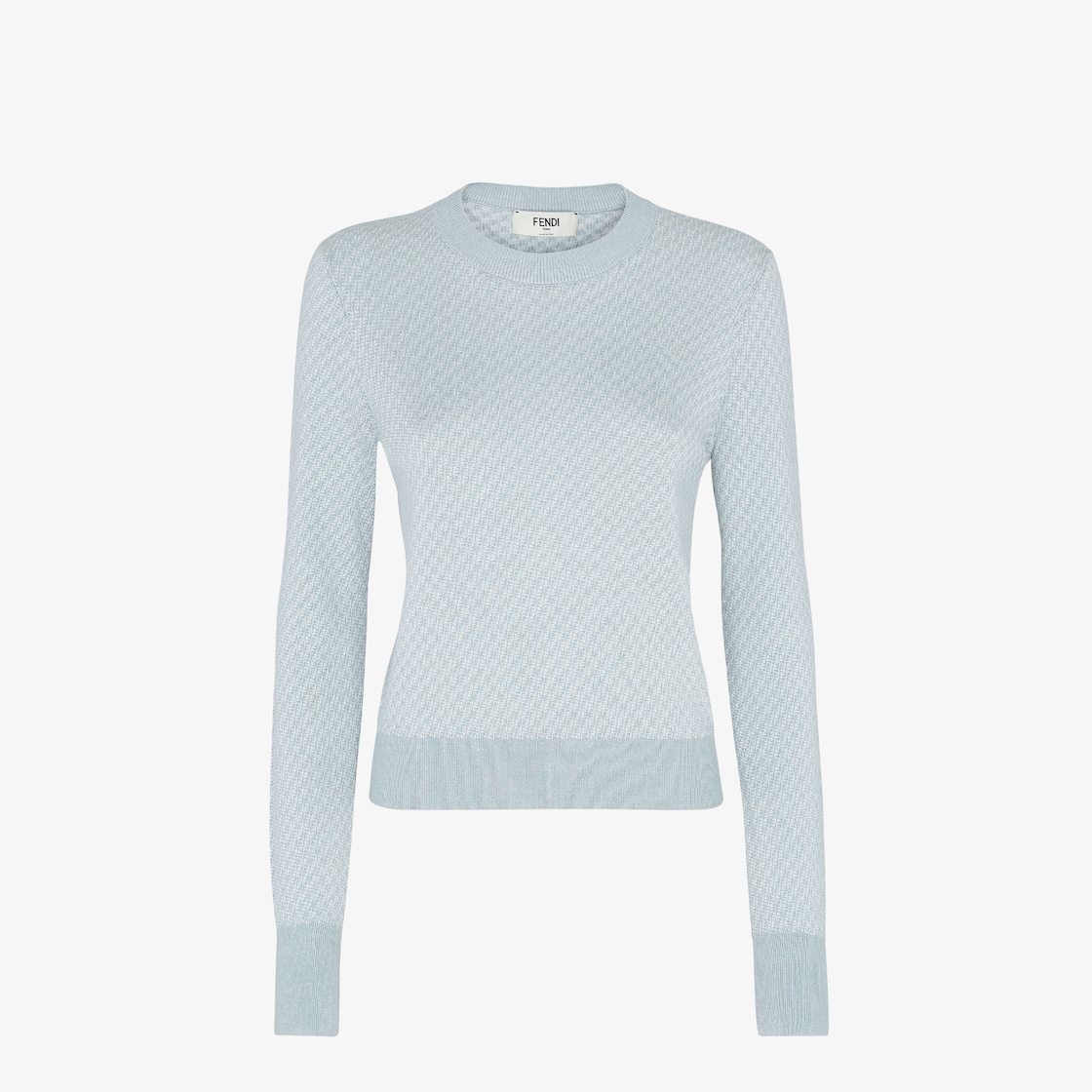 Pull coupe slim à encolure ronde et manches longues. En laine et soie jacquard avec micro motif FF emblématique bleu clair. Finition avec bordures unies finement côtelées.