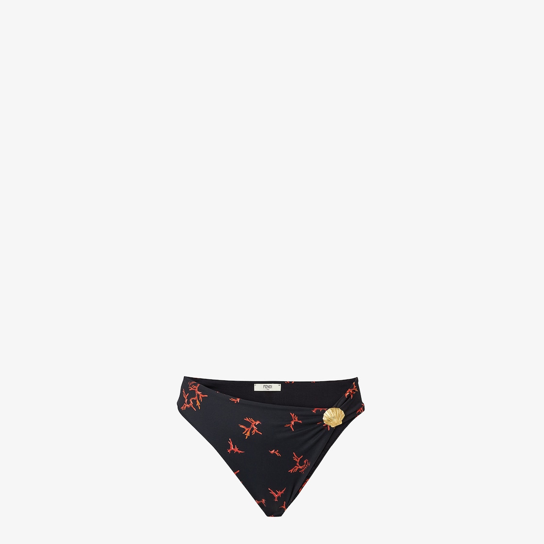 Slip de bain en Lycra® noir avec imprimé corail all-over dans les tons rouges. Orné d’un coquillage doré sur le côté gauche.