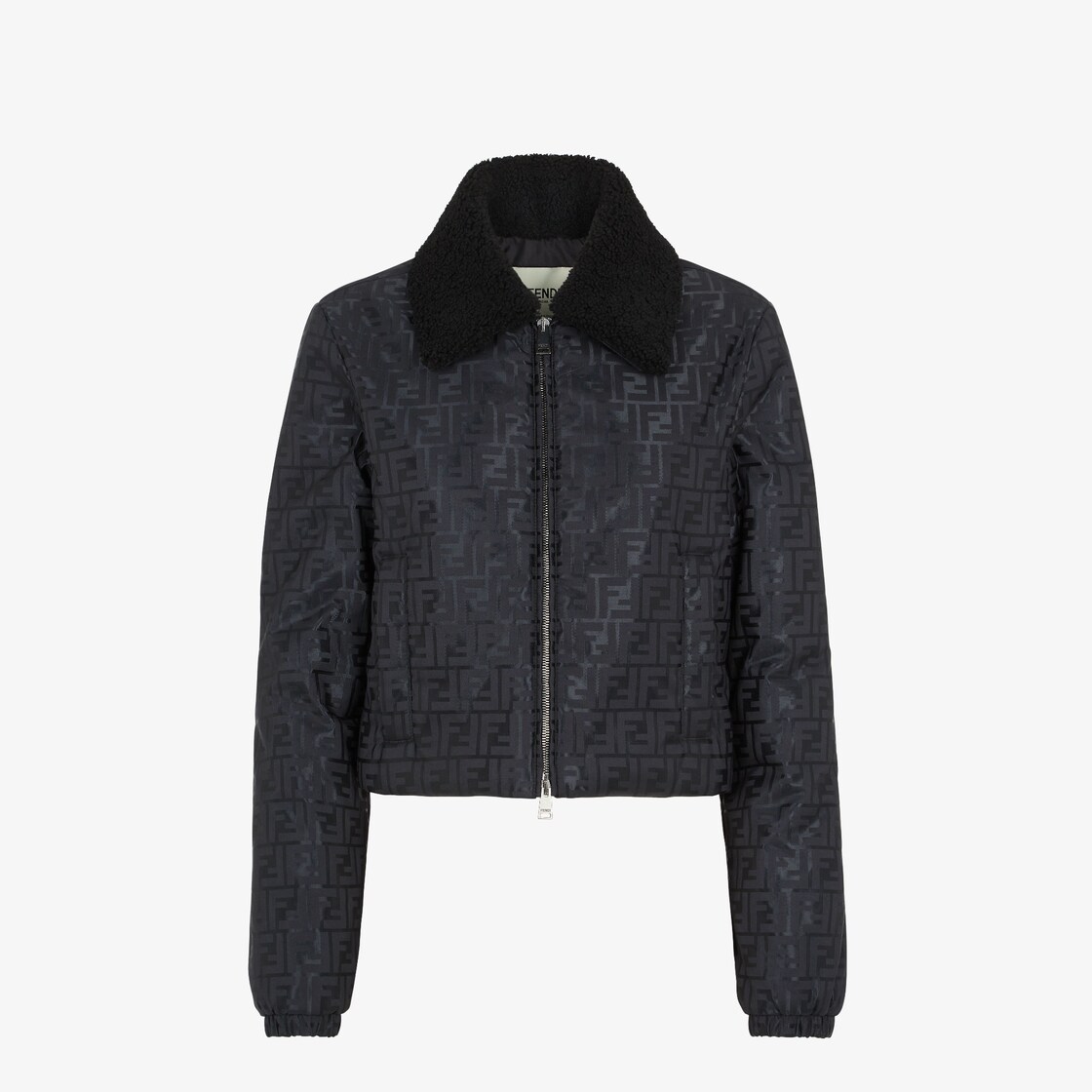 Veste courte rembourrée avec col chemise. Poches latérales et poignets élastiqués. Fermeture zippée à double curseur sur le devant. En nylon technique jacquard avec motif FF emblématique noir. Finition avec col en peau de mouton ton sur ton.