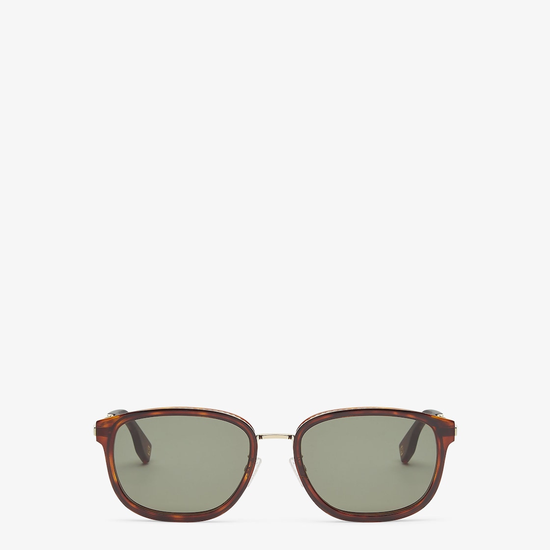 Lunettes Travel de forme ronde avec monture en métal doré et acétate havane foncé. Face associant l’acétate et le métal, ornée du motif FF gravé sur le côté. Branches fines en métal doré et embouts en acétate havane foncé. Plaquettes réglables personnalisées avec logo Fendi. Verres verts.