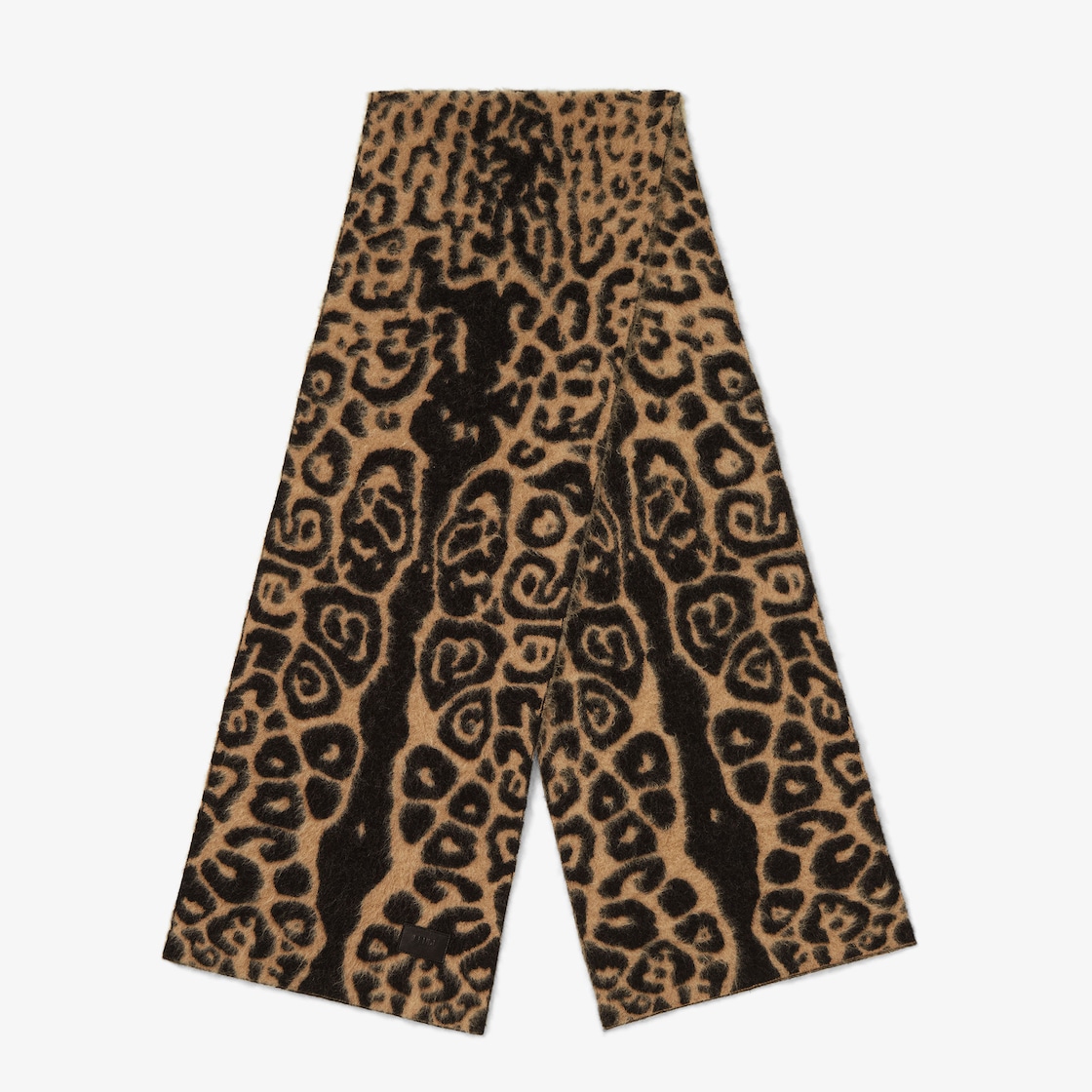 Écharpe rectangulaire réalisée en tissu de laine à poil long, avec l’imprimé exclusif Fendi Leo all-over : une réinterprétation du motif léopard intemporel, inspirée d’un manteau des archives. Écusson Fendi Roma en cuir noir appliqué sur le bas.