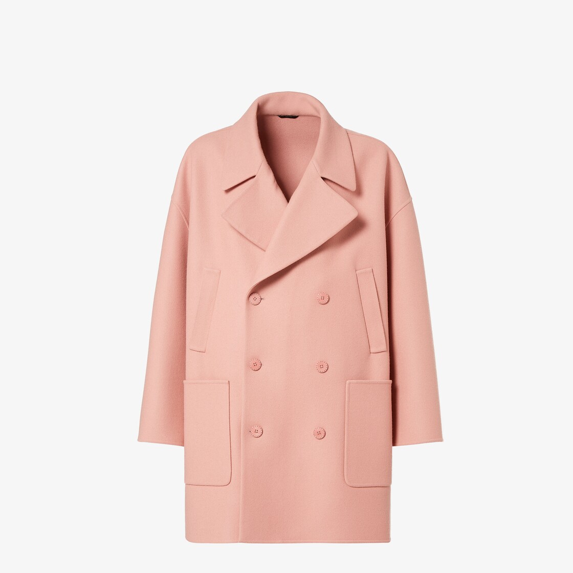 Manteau à double boutonnage modèle caban, avec large revers et manches longues à épaules tombantes. Poches passepoilées diagonales pour se réchauffer les mains et poches basses plaquées. Modèle réalisé en feutre de laine double rose pâle.