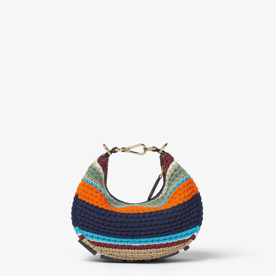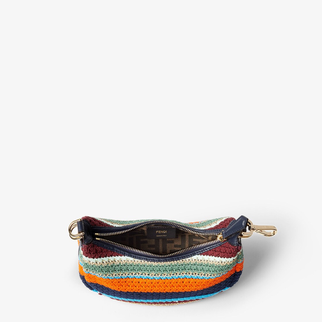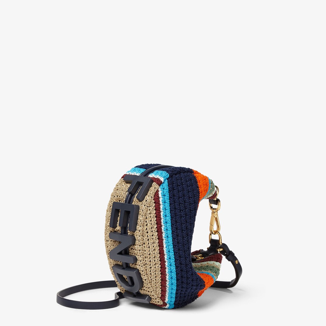 En matière effet raphia et coton tressés au crochet en rayures multicolores, inscription FENDI décorative en cuir bleu nuit sur le fond, visible lorsque le sac est porté sous le bras.